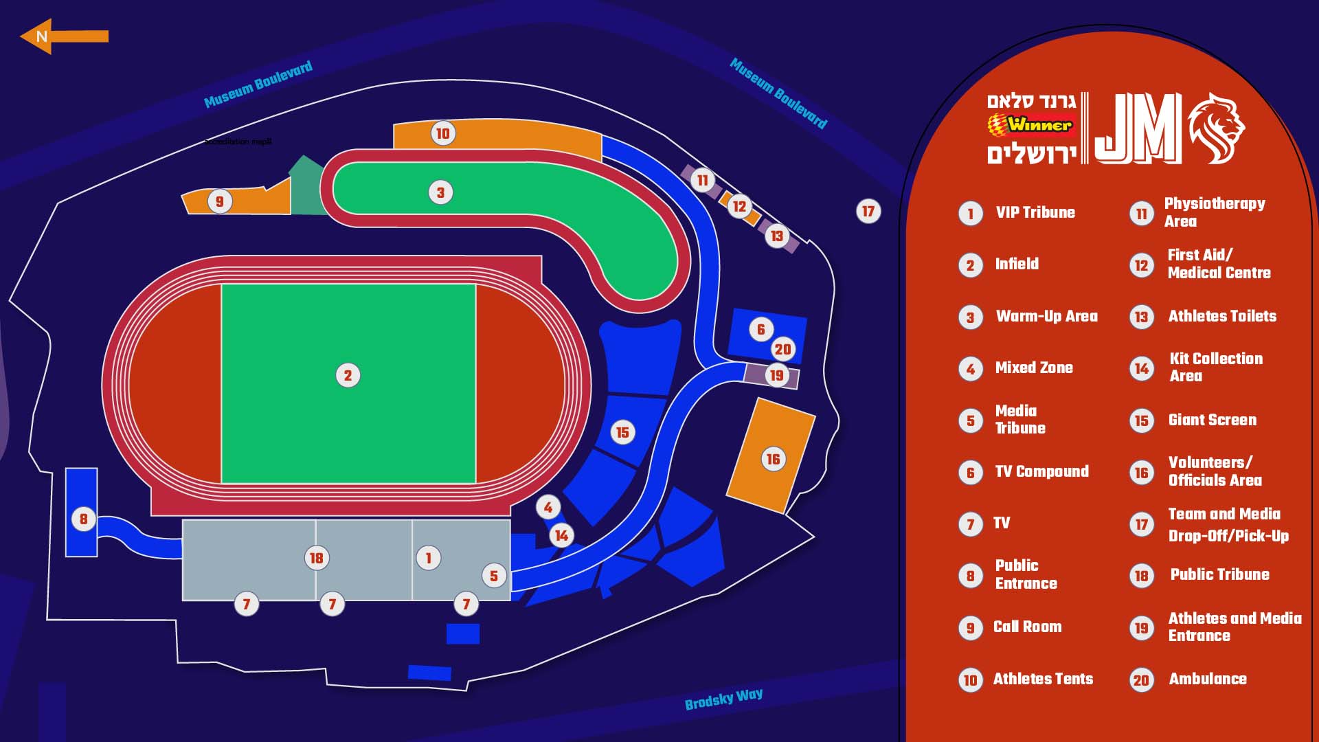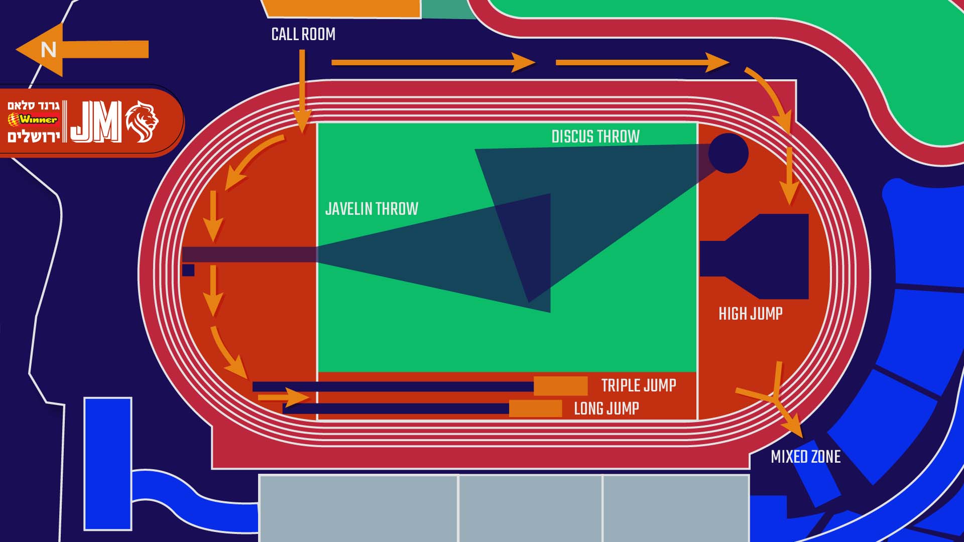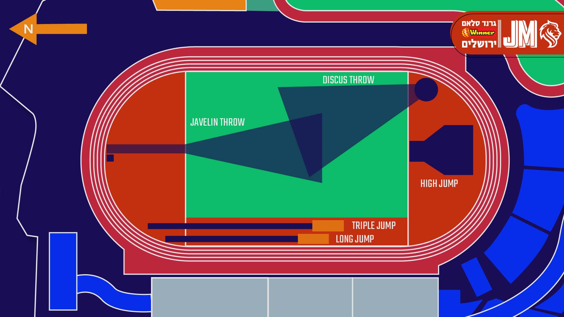 Givat Ram Stadium and its surroundings are shown in appendix. There are 3400 seats in the stadium. A Stadium Map including location of field events is presented in appendix.